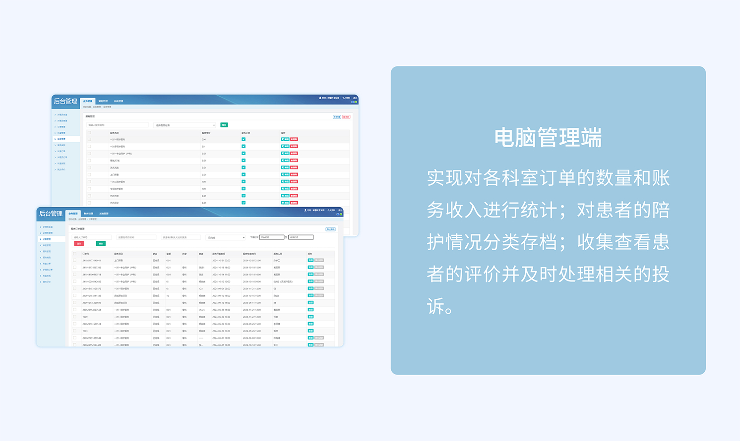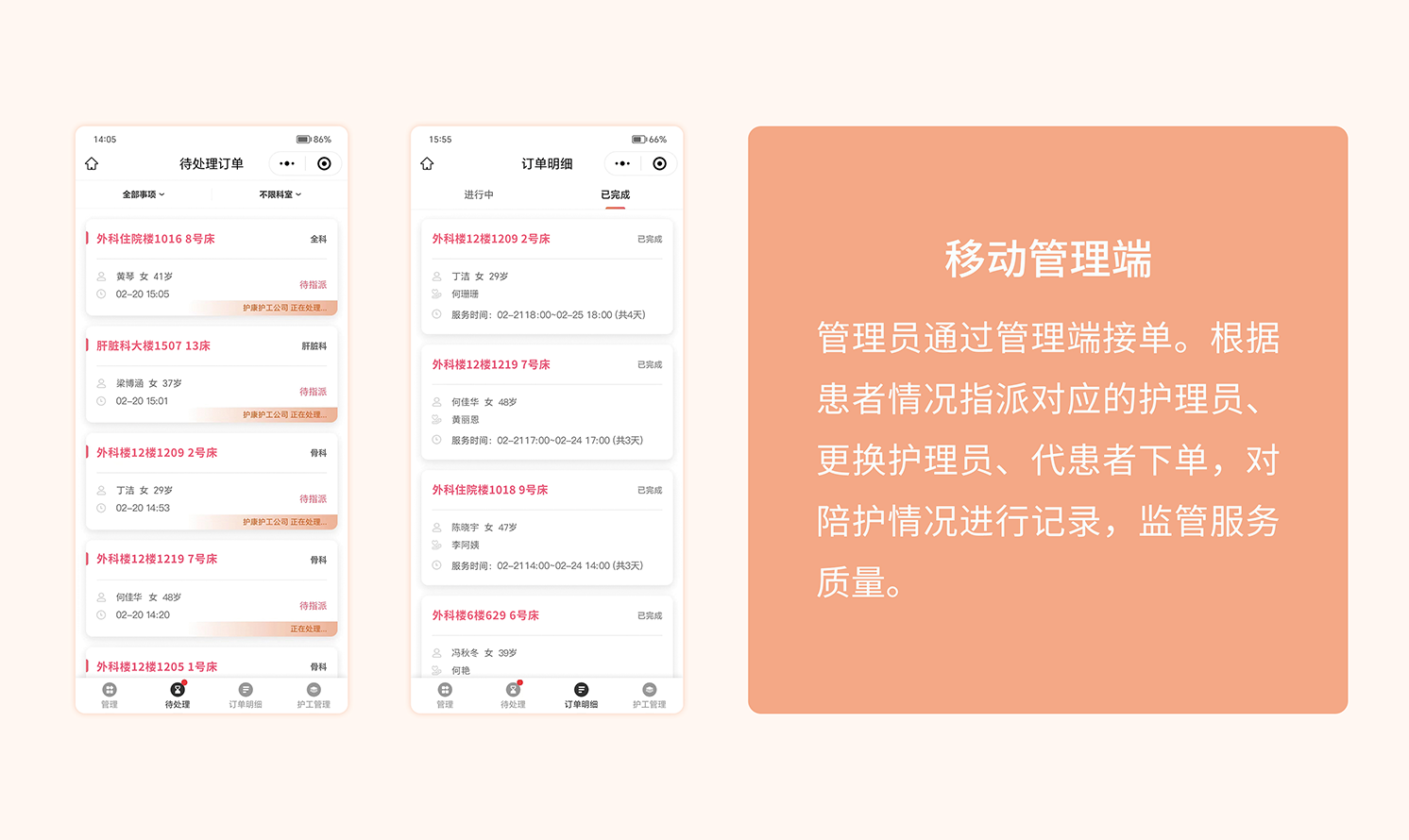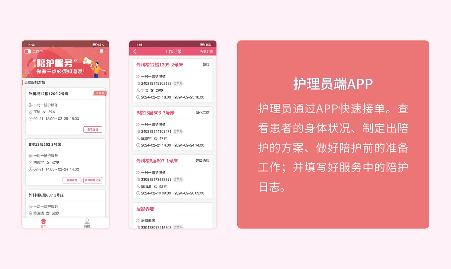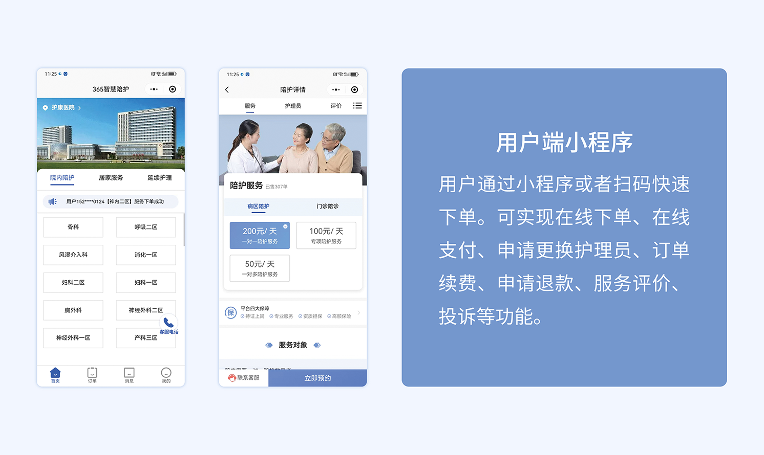 由公司自主研发,系统稳定性和安全性高,用户体验 感好。系统由用户端小程序、护工端APP(安卓版和 苹果版)、医院管理后台组成。