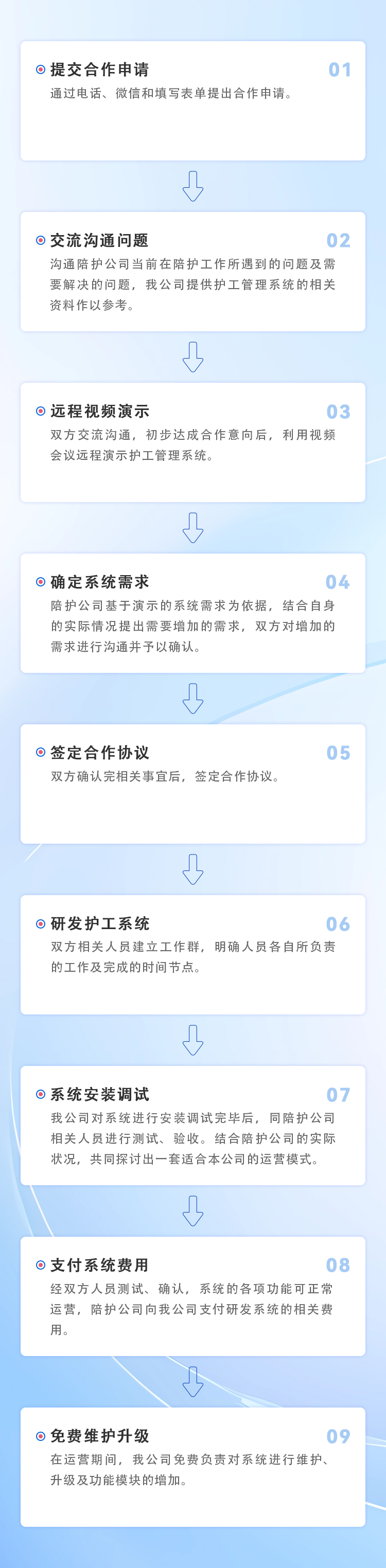 合同期内,采取共同运营、分工负责制的合作模式。我公司负责技术支持,免费对系统进行维护、升级;陪护公司负责主体运营。